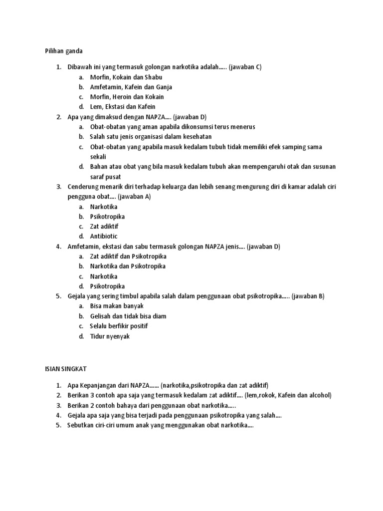 Contoh soal pilihan ganda tentang narkoba dan jawabannya. Check spelling or type a new query. We did not find results for: Maybe you would like to learn more about one of these?